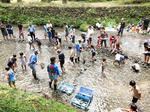 富士宮市北部の猪之頭地区で、美しい陣馬の滝を傍に、太鼓やよさこいの舞台イベント、名産品の鱒のつかみ捕り、地場産品の販売など、自然豊かな地域ならではの催し物がたくさんでした。