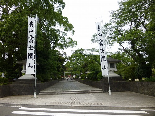 富士山本宮浅間大社の参道に富士開山期間中開山の登り旗が立っています。