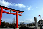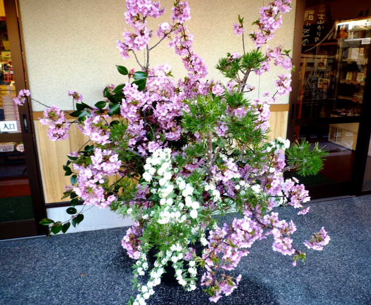 今日は、曇り空です。富士山は雲の間に少しだけ見えます。 天気は午後から下り坂になります。 下の写真は、河津桜です。 静岡県では、一番早く咲く桜で有名です。 色は少し濃い桃色をしています。 観光案内所「寄って宮」となりの、境内売店「ここずらよ」さんの 店先に生けてあります。 みごとな河津桜です。