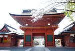 4枚の写真は、浅間大社西門、本殿から参道に続く道、本殿、観光案内所から見た