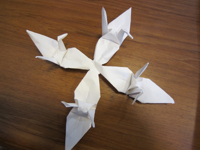 バスの待ち時間、ものの10分程で四羽の鶴ができあがりました!