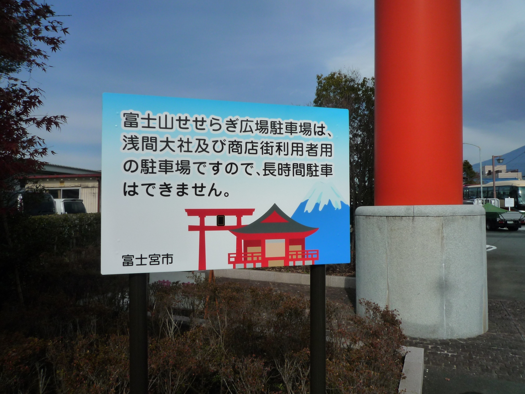 浅間大社の南100M位にあります、富士山せせらぎ広場の駐車場利用についての注意書き看板が出来ました、利用は、朝9時から夜8時までですので、以後はクサリを掛けますのでお願いします。