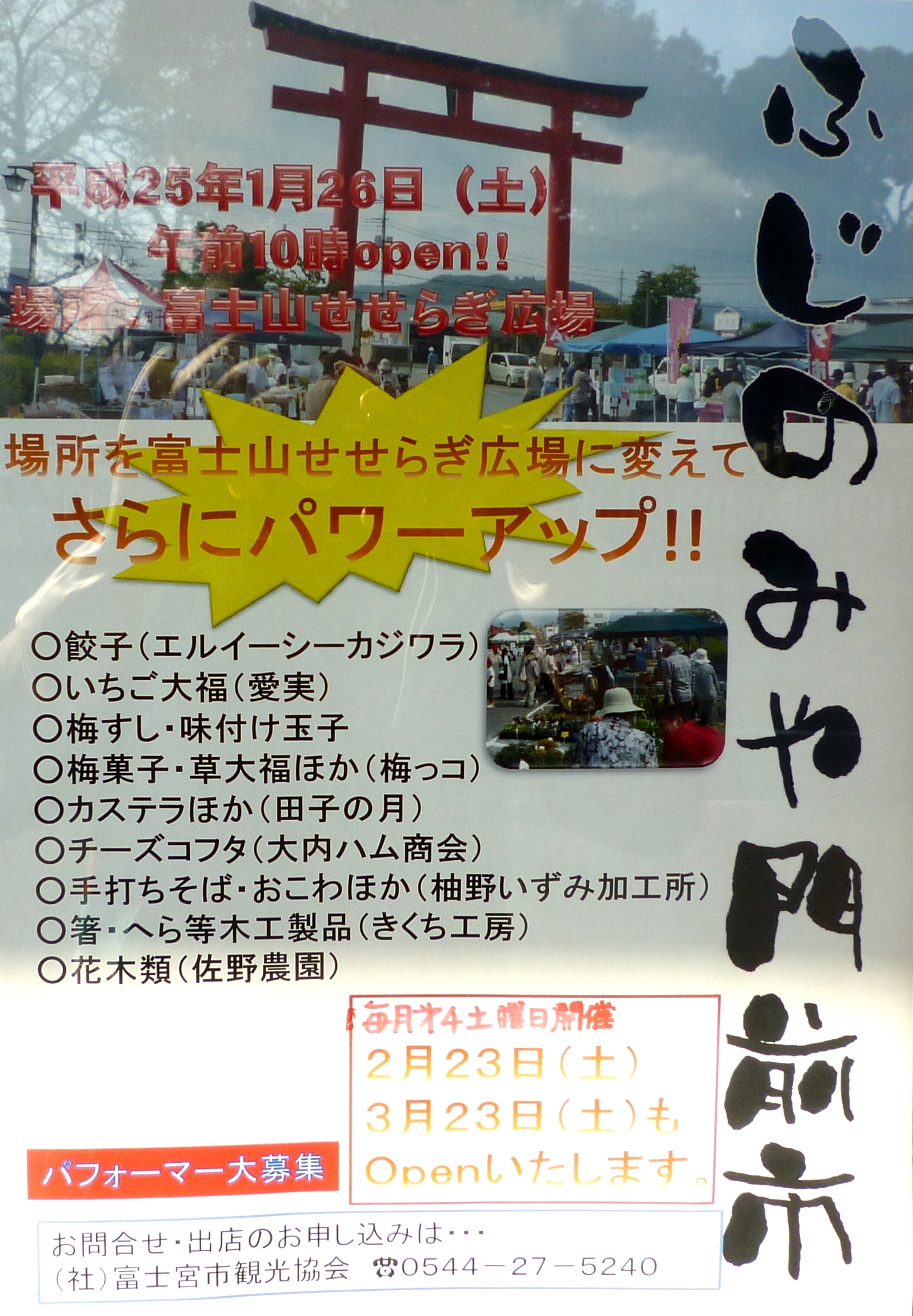 今日は朝から風が冷たくとても寒い一日です。 3日ぶりにすっきりと富士山が見えました。 お知らせです。 1月26日(土)に、「ふじのみや門前市」があります。 場所 せせらぎ広場 時間 10時から14時まで 内容 餃子、いちご大福、梅すし・味付け玉子、梅菓子・草大福、 カステラ、チーズコフタ、手打ちそば・おこわなど、箸・ヘラなどの木工品 花木など多数の出店があります。