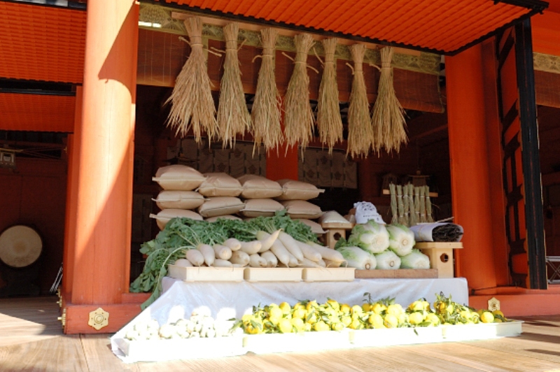 今年収穫した新穀をはじめ、様々な穀物を神前に供えて