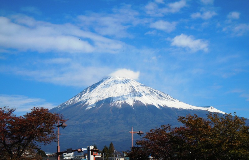 富士山の上に雲がかかり、雲の陰が富士山に映り、雲の大きさが分かります。