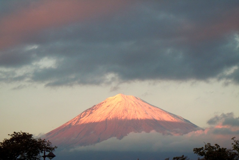 夕焼けで雲が赤く染まり、富士山の雪も赤くなり、