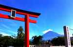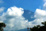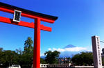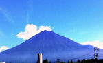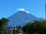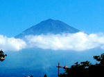 夏の富士山は青く見えます。宝永山(富士山の写真右側に見える小さな山、2,693メートル)