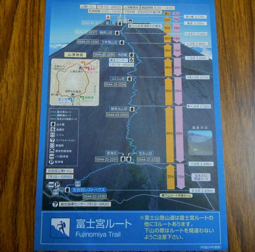 「富士宮ルート」―A4半分サイズのチラシで、富士宮口から頂上までの山室の連絡先、登りと下りの予想時間が記されています。(ブログ写真下)