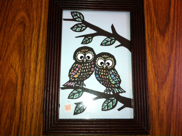 写真右側は今年の新作の「フクロウ額」500円になります。
