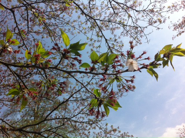 葉桜になり,先週までのみごとな桜色の景色が緑の多い新緑の景色になりました。